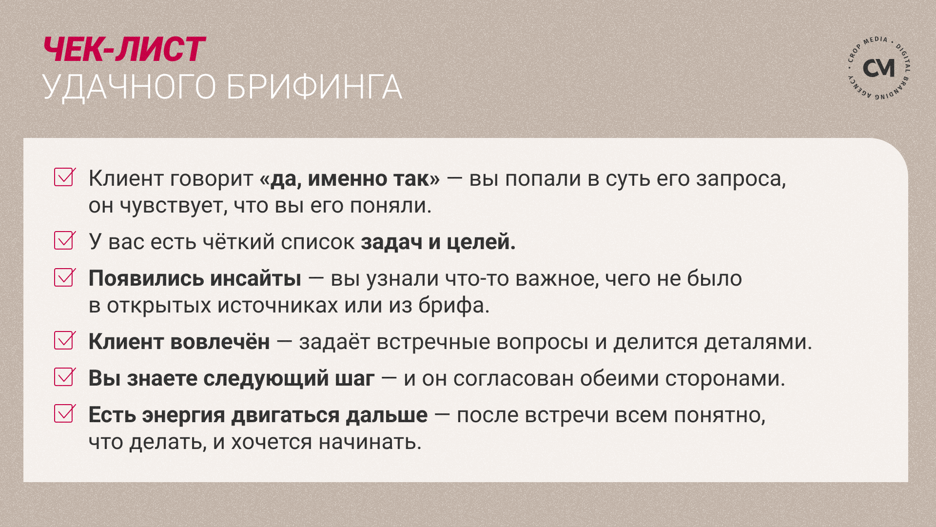Брифинг — это не анкета из 20 однотипных вопросов. Это этап, на котором вы определяете задачи для дальнейшей работы и формируете доверие клиента.